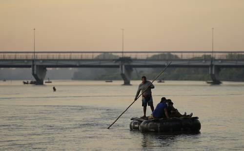 ▲ Antes de llegar a la frontera con Estados Unidos, muchos centroamericanos ponen en peligro sus vidas en el intento de internarse en México a través del río Suchiate. En la imagen, una mujer y su hija cruzan de Guatemala a territorio nacional con todas sus pertenencias colocadas en dos mochilas.Foto Cuartoscuro