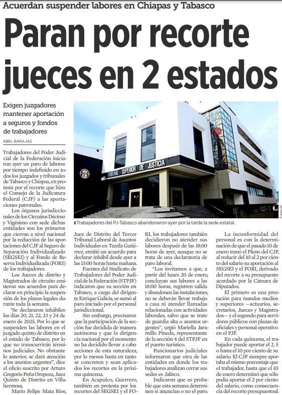 Con un presupuesto aprobado de apenas 62 mil millones de pesos para 2025, se ha dejado al PJF en una situación crítica al reducir en 17.1 por ciento los recursos necesarios para garantizar el funcionamiento adecuado de los tribunales. Este recorte se traduce en menor personal, recursos insuficientes y la imposibilidad de atender con eficiencia los casos judiciales, apuntó.
