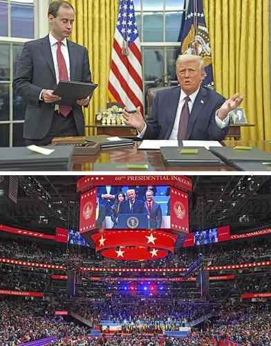 ▲ El presidente estadunidense, Donald Trump, firma decretos en el Capitol One Arena, donde dirigió un discurso a unos 20 mil partidarios luego de tomar posesión del cargo (imagen inferior).Foto Ap