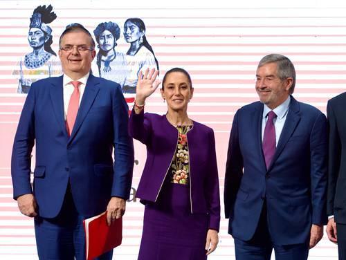 ▲ La presidenta Claudia Sheinbaum Pardo resaltó que ha funcionado nuestra estrategia de cabeza fría, temple y defensa con firmeza de nuestros principios. En la imagen, con el secretario de Economía, Marcelo Ebrard, y el canciller Juan Ramón de la Fuente.Foto Roberto García Ortiz