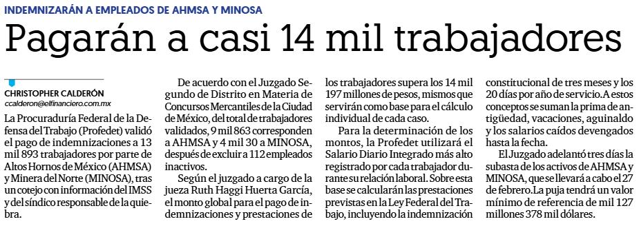 En uno de los procesos recientes más importantes para una empresa en quiebra, el juzgado segundo de distrito de concursos mercantiles adelantó para el 27 de febrero la subasta de los activos de Altos Hornos de México (AHMSA) y su filial Minera del Norte (Minosa) como una sola unidad productiva.