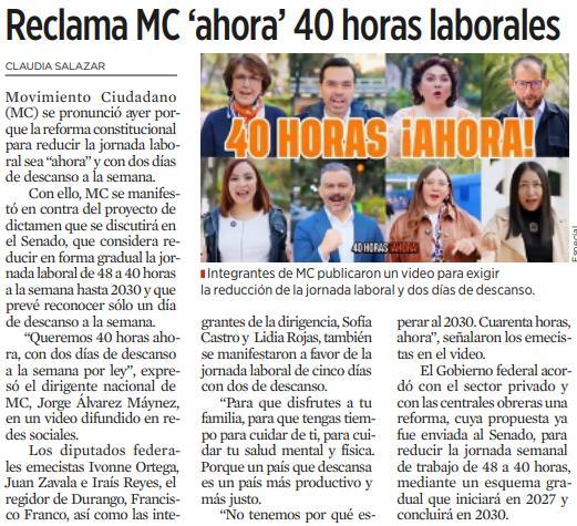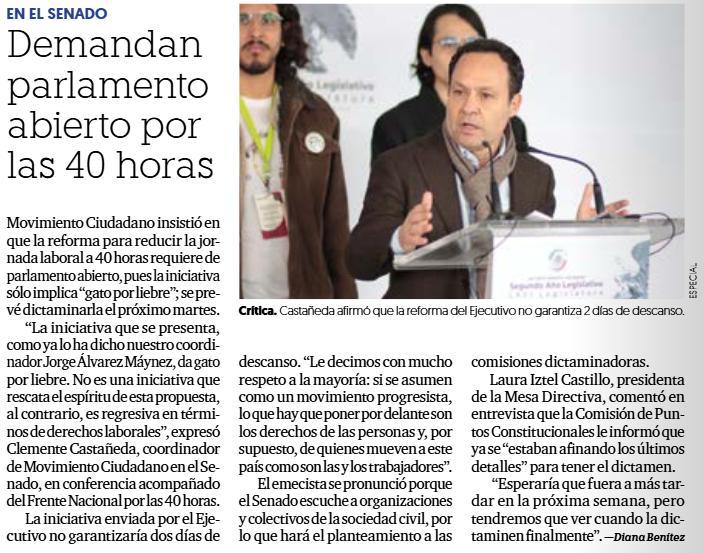 El emecista dio una conferencia de prensa en la que estuvo acompañado por integrantes del Frente Nacional por las 40 Horas. Érick Huehuetzin, representante de la agrupación, denunció que la iniciativa contempla que las horas extras se paguen doble, cuando actualmente se liquidan al triple, y legaliza un esquema de 12 horas de trabajo, cuando el actual es de nueve.