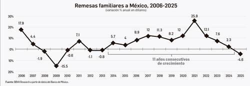 “Tras 11 años consecutivos de crecimiento de las remesas, en los cuales casi se triplicaron estos flujos al pasar de 23 mil 90 millones de dólares en 2013 a 64 mil 746 millones de dólares en 2024, en 2025 se confirma el fin de este periodo alcista”, indicó BBVA en un análisis.