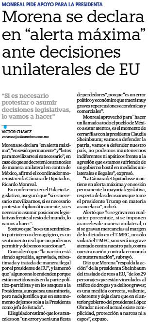frente a esta circunstancia. Los representantes de México han actuado con responsabilidad y seriedad y, como lo dijo la mandataria en su conferencia matutina de ayer, a fin de cuentas la imposición de aranceles es una decisión de un gobierno extranjero que escapa a la jurisdicción del mexicano. Es fundamental, en las condiciones actuales, que las autoridades mantengan informada puntual y claramente a la sociedad, a fin de preservar y robustecer la unidad nacional que el momento demanda.