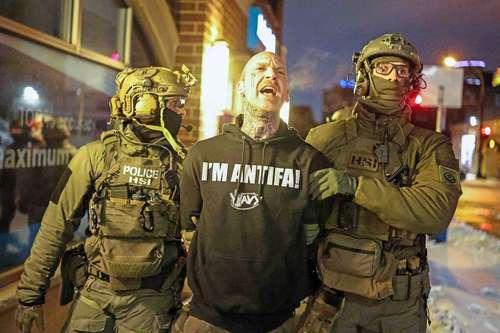 ▲ Agentes federales detuvieron a una persona que portaba una sudadera con un eslogan contra el fascismo, durante otra protesta en Mineápolis.Foto Afp