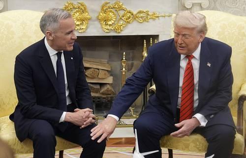 ▲ En el encuentro con el primer ministro de Canadá, Mark Carney, el presidente Trump reiteró sus quejas sobre la relación comercial.Foto Ap