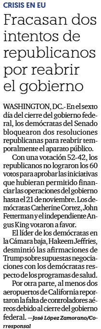 Además, el cierre del gobierno estadounidense entró en su sexto día, con la Casa Blanca amenazando con despidos masivos de trabajadores federales.