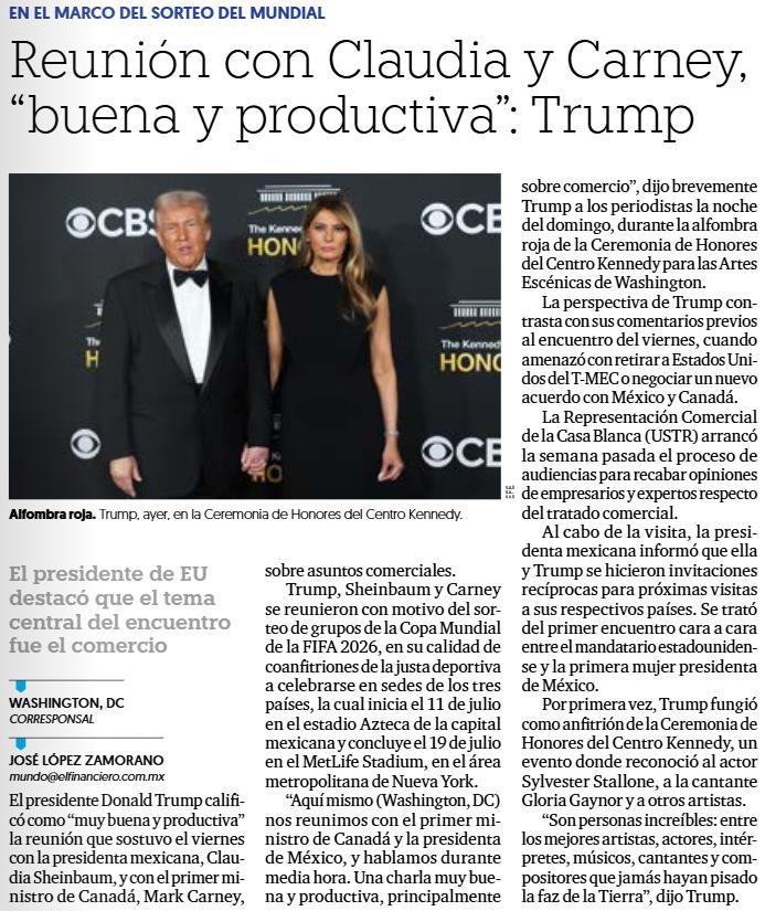 En el Kennedy Center Honors, Trump expresó ayer: “tengo que decir que estoy un poco decepcionado porque Zelensky aún no ha leído la propuesta (de paz estadunidense para Ucrania)”, informó CBS News.