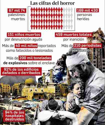 Las operaciones militares israelíes han dejado 67 mil 173 palestinos muertos desde el 7 de octubre de 2023, entre ellos 20 mil 179 niños, 10 mil 427 mujeres y 4 mil 813 ancianos, precisó. Se trató de la primera ocasión en la que se publican los datos desglosados por edad y género.