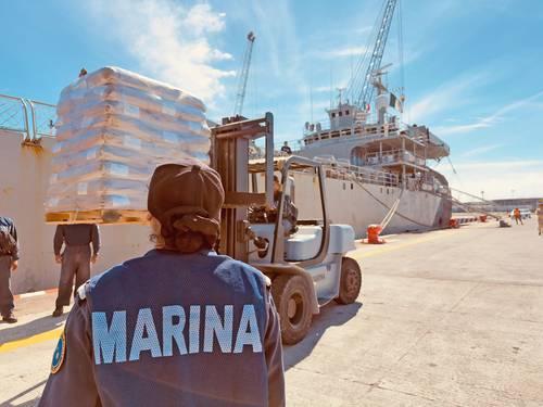 ▲ En el puerto de Veracruz, elementos de la Marina cargaron dos buques con víveres. Se espera que en un plazo de cuatro días las naves atraquen en la isla.Foto de la Marina cedida a Xinhua