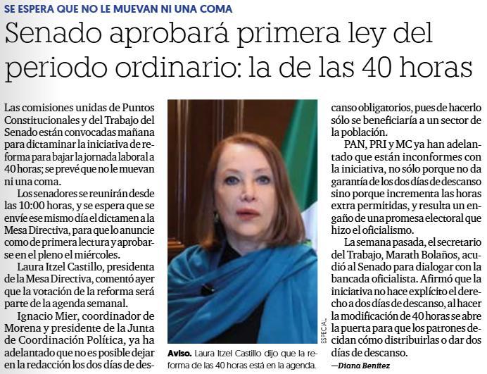 Mañana se dictaminará en comisiones del Senado la reforma constitucional para reducir la jornada laboral a 40 horas, señaló la presidenta de esta cámara, Laura Itzel Castillo.