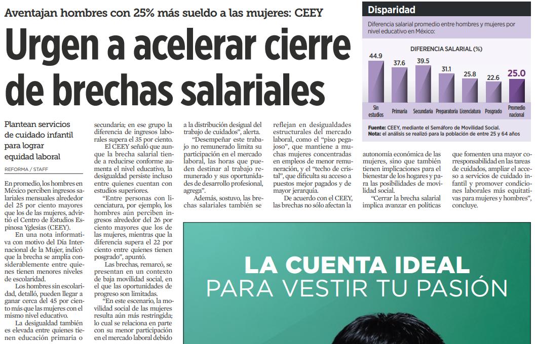 En el territorio nacional, añade el reporte, la brecha salarial se redujo casi a la mitad (de 27% a 13%, 1995-2025), pero persisten los retos.