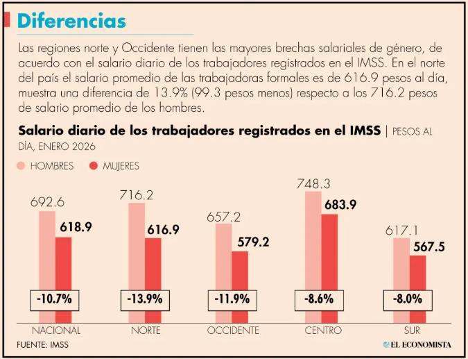 En el norte del país el salario promedio de las trabajadoras formales es de 616.9 pesos al día, muestra una diferencia de 13.9% (99.3 pesos menos) respecto a los 716.2 pesos de salario promedio de los hombres, con base en los registros de enero reciente. De las cuatro regiones en las que el IMSS segmenta al país, el norte tiene la brecha más significativa.