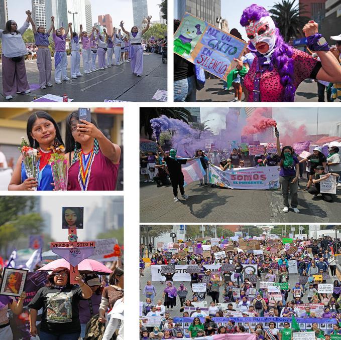 ▲ En conmemoración del Día Internacional de la Mujer, miles se unieron en marchas y manifestaciones que mostraron la diversidad y la fuerza del movimiento. Exigieron alto a la violencia de género y la igualdad en todos los ámbitos de la sociedad. Las movilizaciones no sólo reunieron a distintas generaciones y contextos culturales, sino que también reflejaron un amplio espectro de formas de protesta: pancartas con mensajes de empoderamiento, performances artísticas, cantos y marchas silenciosas que simbolizaban la lucha por un mundo más justo y seguro para todas.Foto Cristina Rodríguez, Jorge Ángel Pablo García, Arturo Campos Cedillo y Ap