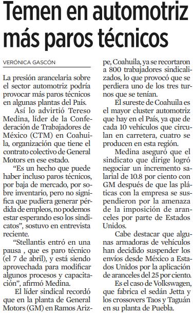 “El sureste de Coahuila es el mayor clúster automotriz del país. Por cada 10 vehículos que circulan en las carreteras, cuatro se ensamblan en esta región”, dijo el líder sindical de la CTM. Tereso Medina, quien añadió que “cuando empieza una empresa a cancelar plazas, le siguen otras más”. Sobre todo, añadió, porque hay afectaciones en la industria automotriz, pero también en el acero y el aluminio.