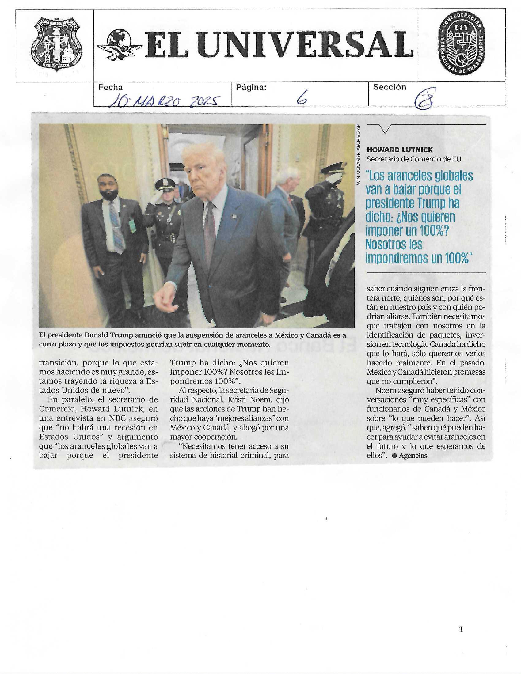 Durante la entrevista, Lutnick adelantó que los aranceles de 25 por ciento a las importaciones de acero y aluminio entrarán en vigor este miércoles, según lo previsto. Canadá y México son los principales exportadores de estos metales a los mercados estadunidenses y el primero concentra la mayor parte de las ventas de aluminio.
