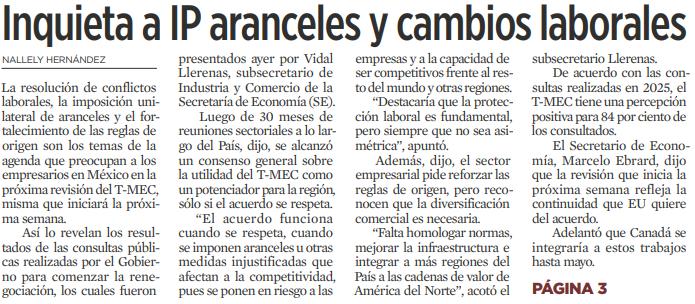 Al respecto, el subsecretario de Industria y Comercio de la Secretaría de Economía, Vidal Llerenas, mencionó que pese a que el T-MEC se considera positivo, hay actores que refieren áreas en las cuales hay oportunidades de mejora.
