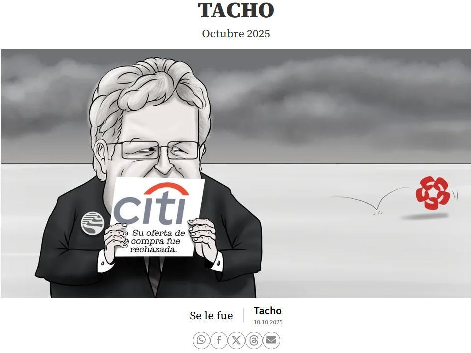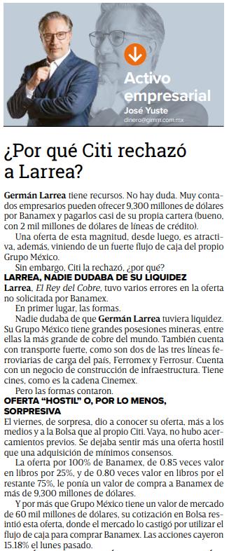 La Jornada (Clara Zepeda) lo reseñó así: “Citigroup no dejó correr los 10 días que le dio de plazo Grupo México, de Germán Larrea, para responderle que rechaza su oferta por 100 por ciento de las acciones de Banamex. ‘Después de evaluar cuidadosamente la propuesta, incluyendo sin limitación consideraciones financieras y de certeza de la operación, hemos comunicado a Grupo México que Citi rechaza su oferta; creemos firmemente que la operación anunciada el 24 de septiembre de 2025 y la oferta pública inicial accionaria planificada nos permitirán completar la desinversión de Banamex de una manera responsable y maximizar el valor para nuestros accionistas’, aseguró ese banco en un comunicado”.