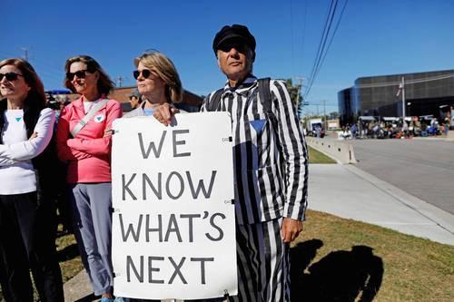 ▲ “Sabemos qué sigue”, dice la pancarta de un manifestante, con vestimenta relacionada a víctimas del Holocausto nazi, cerca de las oficinas migratorias en Broadview, Illinois.Foto Afp