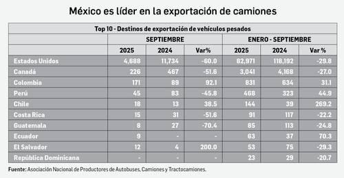 Estados Unidos fue el principal destino de las exportaciones de vehículos pesados, con 94.5 por ciento del total en septiembre; en agosto fue de 94.8 por ciento del total.