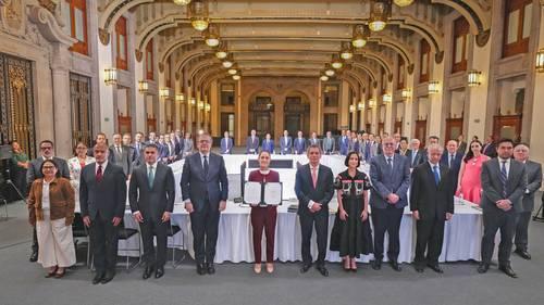 ▲ La presidenta Claudia Sheinbaum (al centro), acompañada de empresarios de compañías productoras y comercializadoras de alimentos, así como miembros del gabinete, durante la renovación del Paquete contra la Inflación y la Carestía.Foto Presidencia