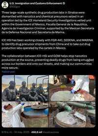 Ante la difusión de una fotografía para reivindicar la supuesta participación de sus agentes del Servicio de Inmigración y Control de Aduanas (ICE, por sus siglas en inglés) de Estados Unidos –que reprodujo su embajada en México– en el desmantelamiento de laboratorios para elaborar drogas, la presidenta Claudia Sheinbaum sostuvo que sí fue una denuncia de estas instituciones de Estados Unidos, pero toda la operación la realiza la Fiscalía General de la República y pide apoyo de la Defensa, de la Marina o de la Secretaria de Seguridad Pública para hacer estas actividades.