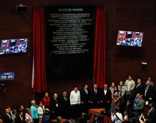 En sesión solemne se colocó ayer en el Muro de Honor del Senado y en letras doradas, la leyenda: A las y los maestros de México, por su contribución del desarrollo del país, en un recinto lleno por los integrantes del magisterio.