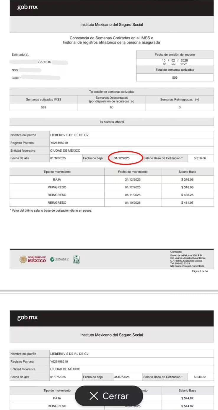 La primera captura muestra que los ingresos de Carlos M. superaron el umbral en diciembre, pero la segunda imagen muestra que fue dado de baja del seguro en ese mes por Lieber BV, S. de R.L. de C.V., razón social alterna usada por Uber para dar de alta a trabajadores ante el IMSS.