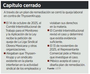 El caso se cerró a satisfacción de la Oficina del Representante Comercial de Estados Unidos gracias a que ThyssenKrupp cumplió con sus obligaciones laborales.