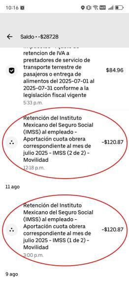 DiDi también le descontó una cuota de seguridad social a Fernando del Pozo en septiembre y omitió darlo de alta ante el IMSS, según consta al comparar la captura de la retención de 624 pesos con su hoja de cotización.