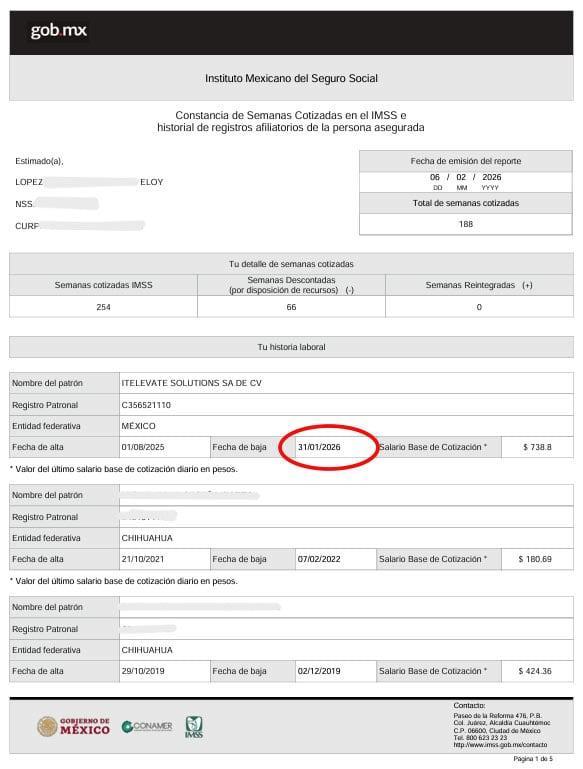 Capturas de pantalla muestran que las ganancias de Eloy López superaron el umbral en enero y que DiDi le retuvo una cuota de seguridad social. Sin embargo, su constancia ante el IMSS muestra que en febrero fue dado de baja por Itelevate Solutions S.A. de C.V., razón social alterna usada por DiDi para dar de alta a trabajadores.
