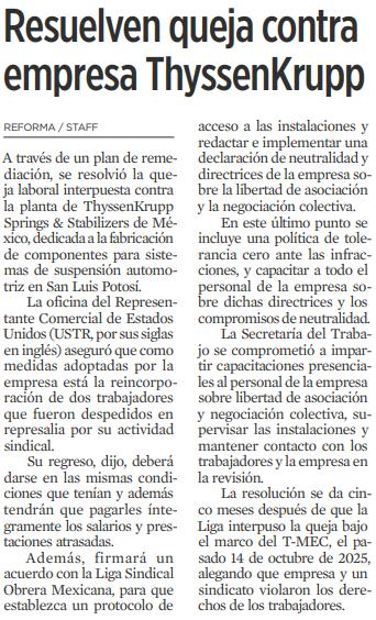 El gobierno de Estados Unidos anunció la resolución del Mecanismo Laboral de Respuesta Rápida (MLRR) en la planta de ThyssenKrupp Springs & Stabilizers de México, luego de la denuncia presentada por trabajadores y sindicatos, la empresa debió implementar medidas de remediación para restablecer derechos laborales vulnerados en su instalación de San Luis Potosí, lo que permitió la reanudación de la liquidación de aranceles para sus componentes de suspensión automotriz.