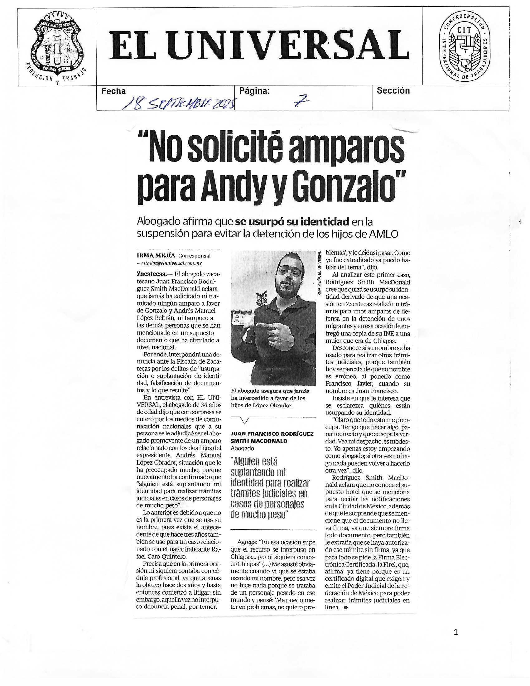 En ese contexto, el caso más reciente se registró ayer, cuando dos juzgados federales, uno con sede en la Ciudad de México y otro en Zacatecas, concedieron suspensiones contra cualquier orden de aprehensión –sin evidencia que sustentara que la solicitud fuera realizada por los hermanos Andrés Manuel y Gonzalo López Beltrán, hijos del ex presidente Andrés Manuel López Obrador–, lo cual es “un engaño y una bajeza de quienes presentaron los escritos. Metieron unos nombres medio rimbombantes para perjudicarlos”, subrayaron los litigantes.