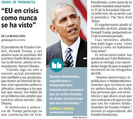 El ex presidente Barack Obama, en sus primeros comentarios, condenó el asesinato y deploró las divisiones y actos violentos de intolerancia, y consideró que esas tensiones han llevado a lo que calificó de “crisis política de un tipo que jamás hemos visto anteriormente”.