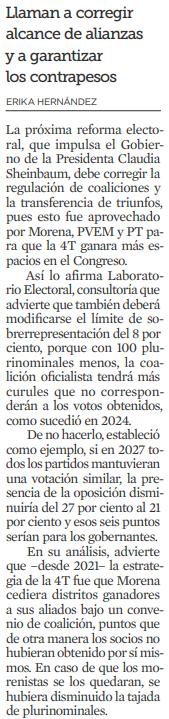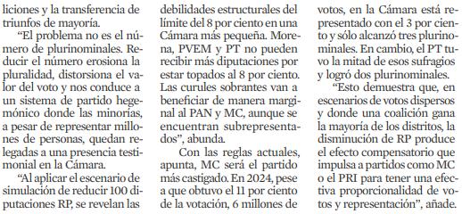 Aunque confió en que si no se logran consensos entre todas las fuerzas políticas se posponga la discusión, refirió que de iniciar el debate de sobre la enmienda, MC planteará que debe analizarse cómo evitar que entre dinero del crimen organizado en las campañas, tema que, aseveró, no ha sido parte de la agenda del bloque mayoritario. Además, dijo que debería transitarse a una “justicia electoral” en la que el número de legisladores de cada partido refleje la cantidad de votos que obtuvo.