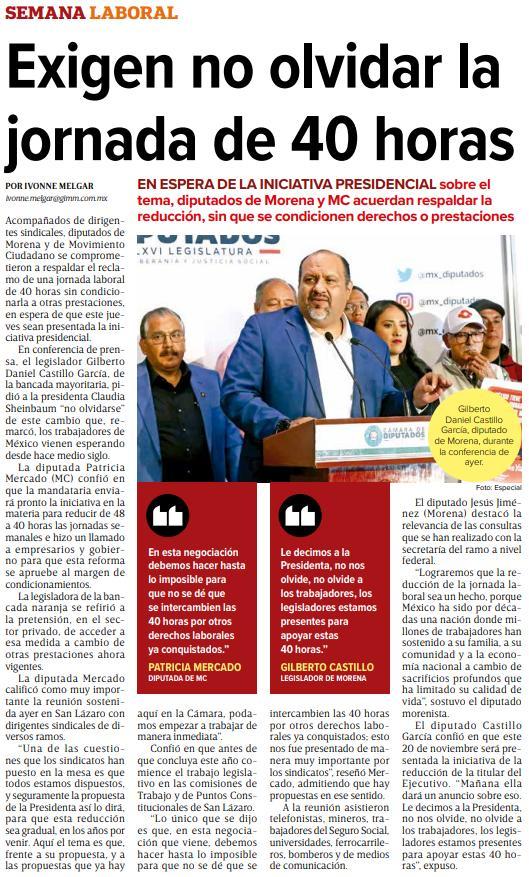 En conferencia de prensa, al salir del encuentro, diputados de diversos grupos parlamentarios se comprometieron a aprobar la iniciativa de reducción de la jornada laboral. Jesús Jiménez (Morena), suplente del legislador ylíder minero