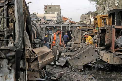 ▲ Inspección de daños en un garaje de la municipalidad de Jabaliya que fue impactado ayer por bombas israelíes.Foto Afp
