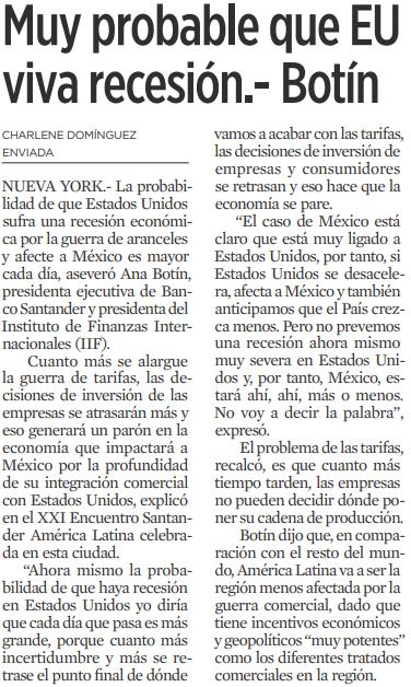 La Jornada (Dora Villanueva) lo reseña así: la economía mexicana caerá en recesión este año y, aunque se proyecta cierta recuperación en 2026, las perspectivas de crecimiento para México son las más castigadas por el FMI, luego de los amagos y medidas comerciales que, en menos de tres meses, ha lanzado la administración de Donald Trump. Debido al impacto de los aranceles impuestos por Estados Unidos, la incertidumbre y las tensiones geopolíticas asociadas, así como mayores dificultades para acceder a financiamiento, el organismo proyecta que este año la economía mexicana caiga 0.3 por ciento y que el próximo repunte 1.4 por ciento, Ningún país será tan afectado por la incertidumbre y las medidas comerciales lanzadas por la administración de Estados Unidos como México.