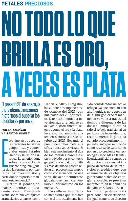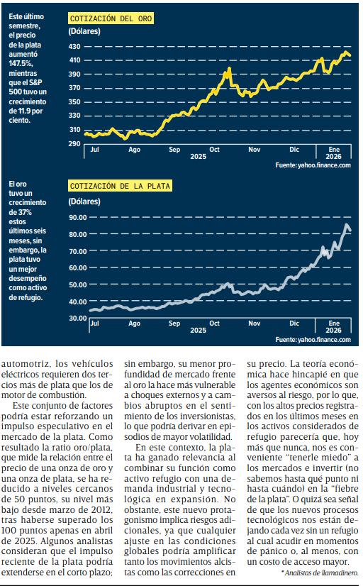 En lo que va del primer mes del 2026, el precio internacional de oro al contado tiene un avance de 14.40% a 4,936.37 dólares por onza, mientras que el de la plata ha subido 34.91% a 96.18 dólares la onza.