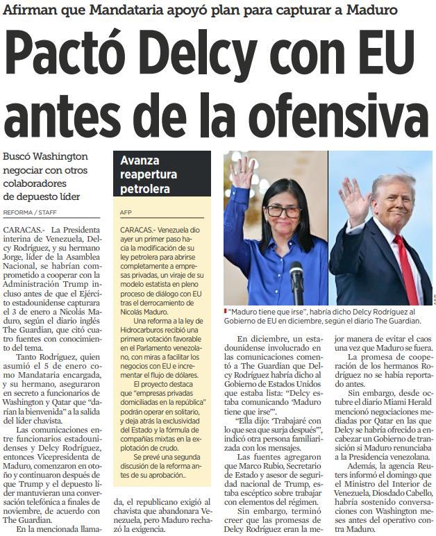 Caracas. El gobierno de Venezuela desmintió la información publicada por el diario británico The Guardian que aseguraba que Delcy Rodríguez, actual presidenta encargada, y su hermano Jorge Rodríguez, presidente de la Asamblea Nacional, habrían negociado y asegurado su colaboración con Estados Unidos tiempo antes de que una operación militar estadunidense secuestrara y sacara al presidente Nicolás Maduro y a su esposa, Cilia Flores, del país.
