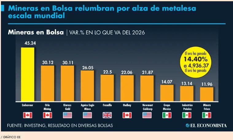 Expertos consideran que los papeles de las empresas mineras en la BMV han registrado alzas significativas, impulsadas principalmente por factores como el rally en los precios del oro y la plata, tensiones geopolíticas e incertidumbre, expectativas de política monetaria y la demanda de metales industriales.