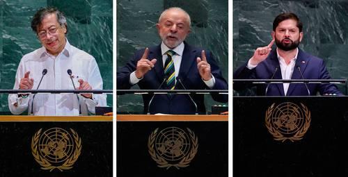 ▲ Los mandatarios de Colombia, Gustavo Petro; Brasil, Luiz Inácio Lula da Silva, y Chile, Gabriel Boric, durante su participación en Naciones Unidas.Foto Afp