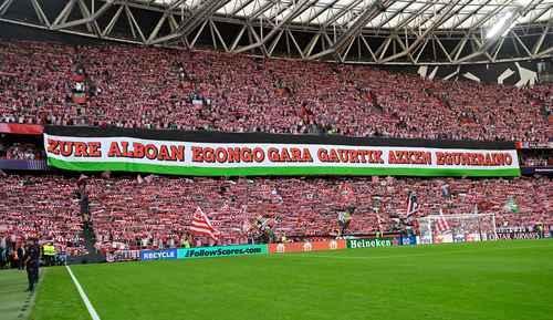 ▲ En una gran manta con la leyenda “Estaremos a tu lado hoy y siempre”, aficionados del Athletic de Bilbao manifestaron su apoyo al pueblo palestino durante su reciente duelo en la Champions Foto Afp
