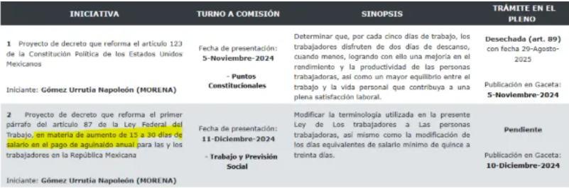Aparte de la jornada laboral de 40 horas, una de las iniciativas pendientes en materia laboral es el aguinaldo doble (o de 30 días), una propuesta realizada por el legislador Napoleón Gómez Urrutia desde el anterior periodo de sesiones y se mantiene pendiente, de acuerdo con el Sistema de Información Legislativa (SIL).