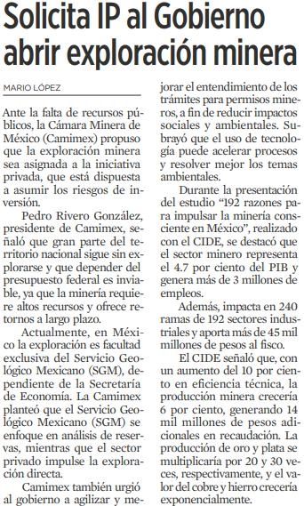 El Centro de Investigación y Docencia Económicas (CIDE) y la Cámara Minera de México (Camimex), realizaron un análisis de ese sector en México, según el cual, si se registra un aumento de 10% en la eficiencia operativa de esa actividad, se podría generar un impacto en la producción nacional de más de 18,000 millones de pesos, con un efecto multiplicador en el resto de la economía por más de 64,000 millones de pesos. Eso se traduciría en un aumento en la recaudación fiscal superior a los 14,000 millones de pesos.
