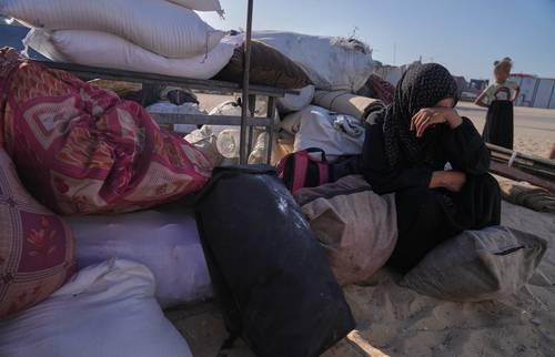 ▲ Raeda Alian fue evacuada con sus pertenencias de la ciudad de Gaza y llegó a un campamento para palestinos desplazados en Muwasi, en el sur de la franja.Foto Ap