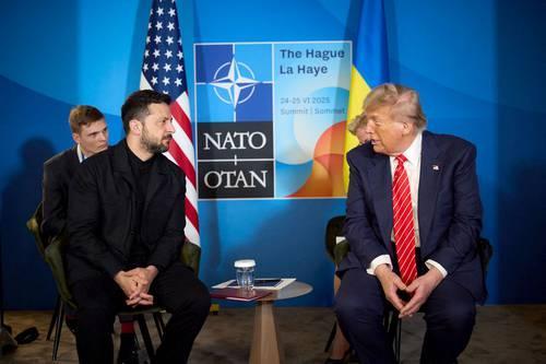 ▲ Los mandatarios de Ucrania, Volodymir Zelensky, y de Estados Unidos, Donald Trump, platicaron en La Haya, Países Bajos, sobre cómo lograr una paz duradera frente a Rusia.Foto del gobierno de Ucrania vía Afp