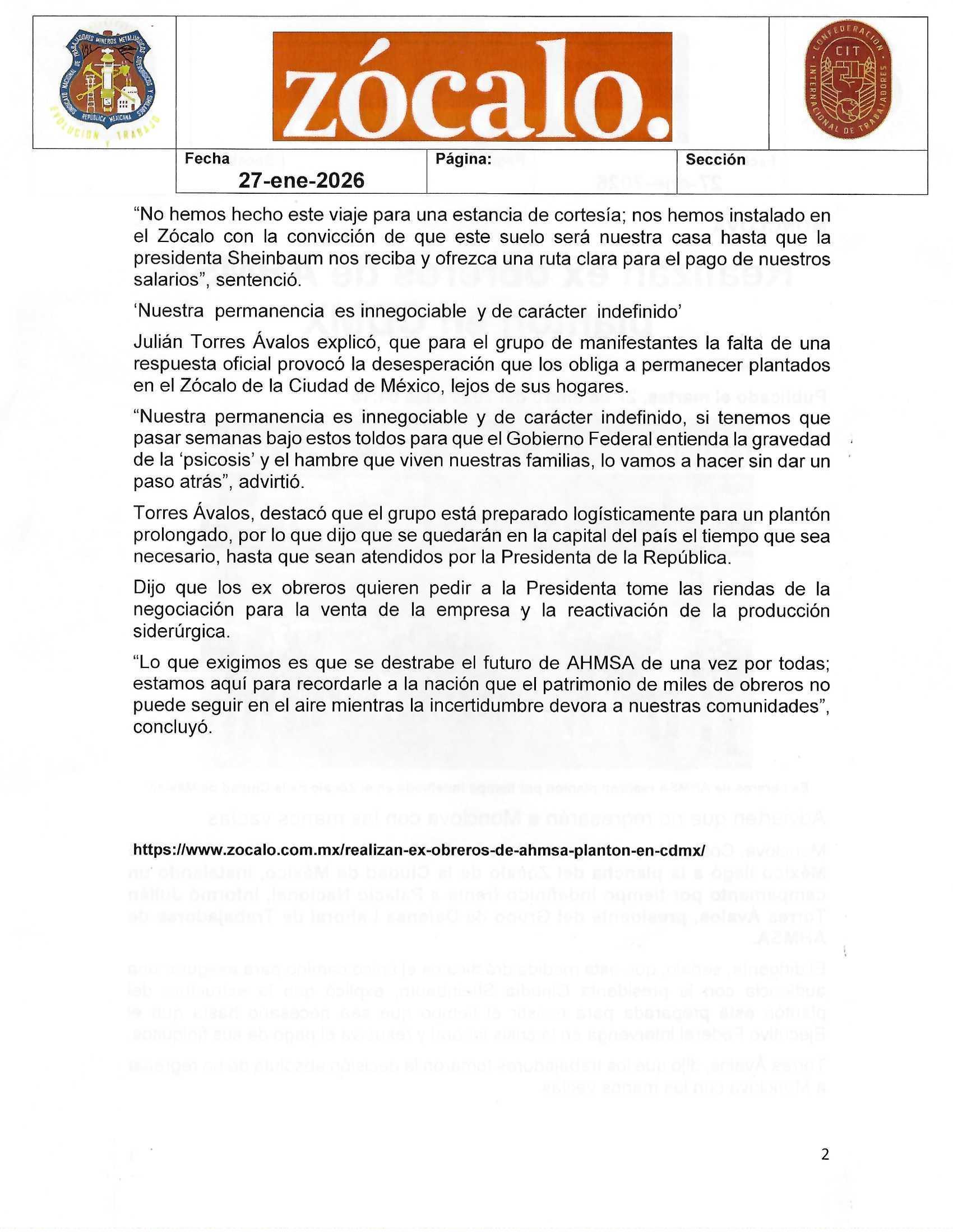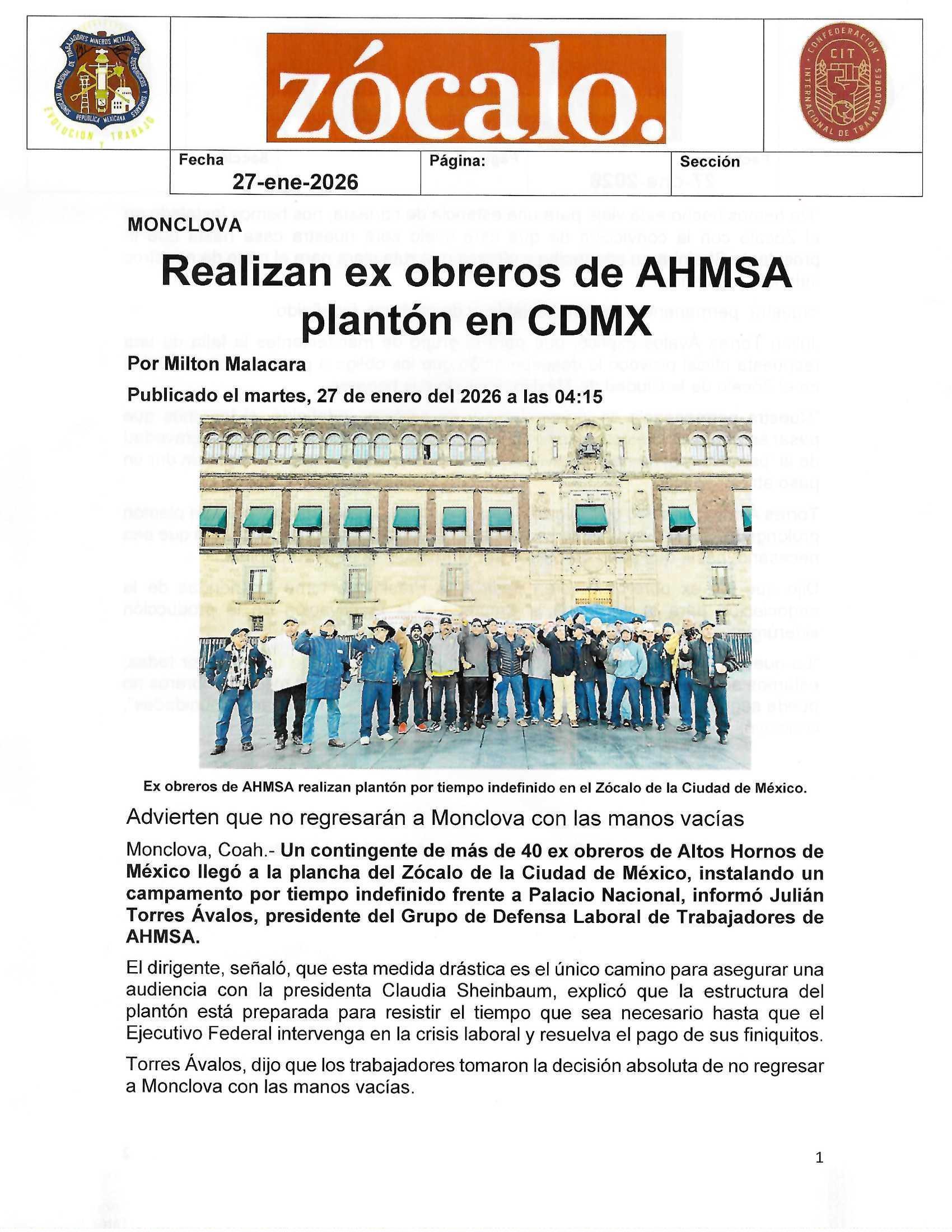 Un grupo de 44 trabajadores de Altos Hornos de México (AHMSA), declarada en quiebra, instalaron ayer un plantón frente a Palacio Nacional en Ciudad de México, donde permanecerán “el tiempo que sea necesario” hasta que se puedan reunir con la presidenta Claudia Sheinbaum.
