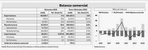 Para 2025 en su conjunto, la balanza comercial exhibió un superávit de US$771 millones, el cual se compara con el déficit de US$18.541 millones observado en 2024, de acuerdo con la información oportuna de comercio exterior a diciembre 2025, publicada por Banco de México este martes 27 de enero.