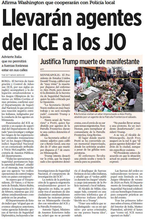 El vicepresidente estadunidense, JD Vance, y el secretario de Estado, Marco Rubio, asistirán a la ceremonia de apertura de los Juegos Olímpicos de MilánCortina el 6 de febrero. “El ICE, como tal, no operará nunca en Italia, puesto que la gestión del orden público, de la inmigración y de la seguridad compete a nuestras fuerzas de policía”, aseguró el lunes pasado el ministro del Interior italiano Matteo Piantedosi, quien estuvo reunido ayer con el embajador estadunidense en Roma.